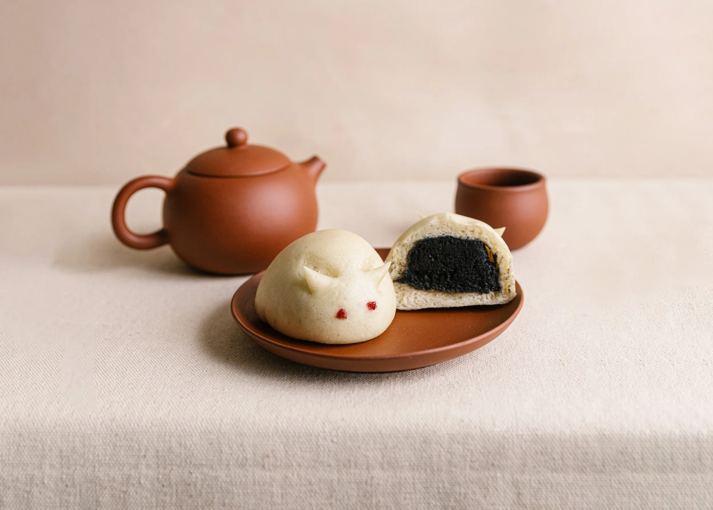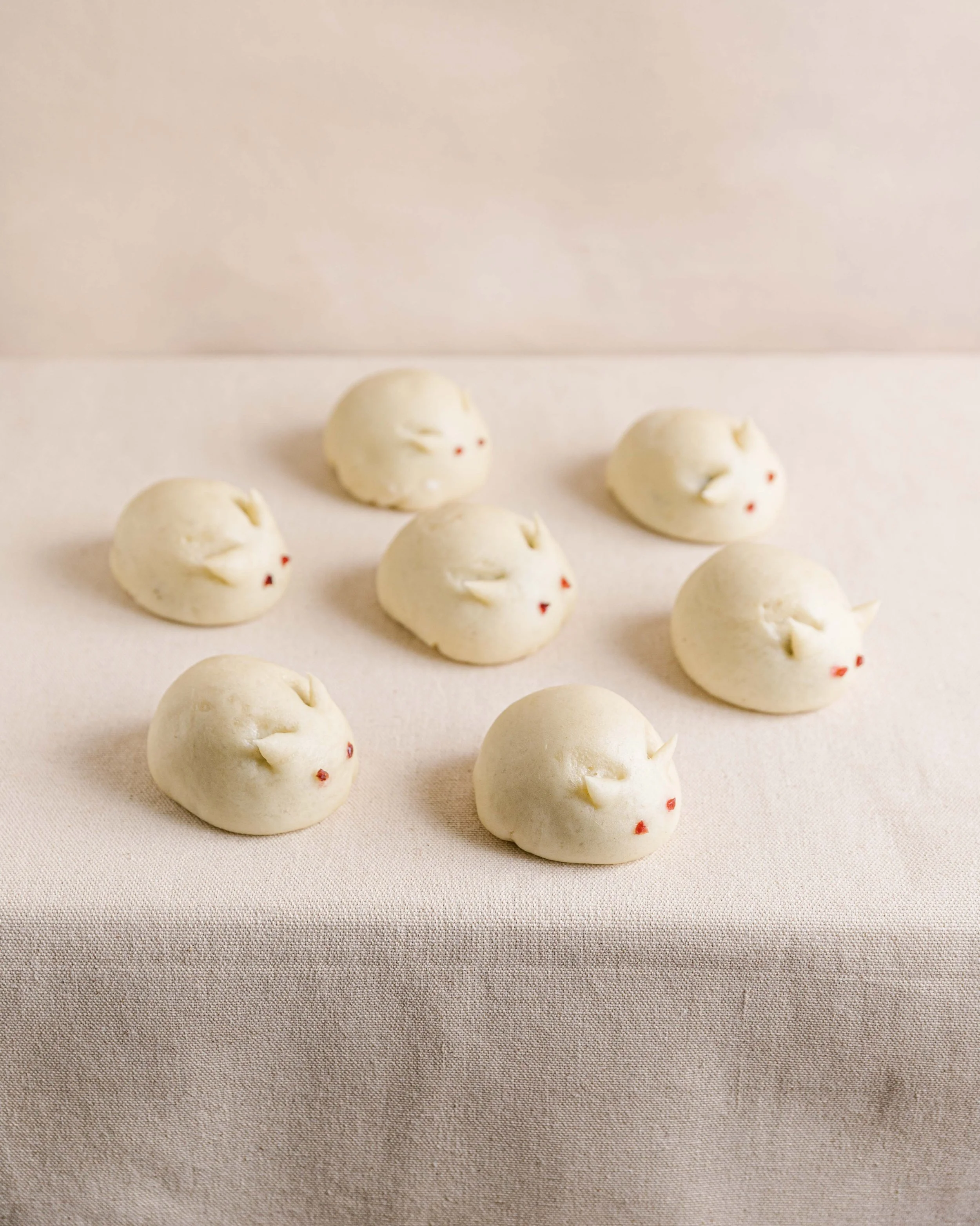- Seal the bun with a series of pinches to form the pointy top of the bun. Repeat with the remaining dough and filling. Place all pleated buns in the steamer.For rabbit buns: Follow the recipe until step 3. When you are finished pleating the bun, flip it upside down and shape the bun into a long oval, making one side pointier for the rabbit face. Using scissors, make two small snips on either side of the rabbit's face to create the ears. Wet the rabbit face and add two black sesame seeds (or cranberry pieces) for the eyes. Continue onto step 4 for the second rising.